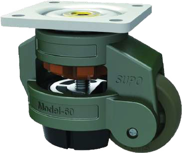 Rueda: En nylon y pata en caucho de alta capacidad de carga. Dureza 65D. Soporte: En aluminio de alta capacidad de carga. tornillo nivelador con mariposa ajustable. Sugerencias de uso: Máquinas extra pesadas. funcionalidad combinada pata y rueda.